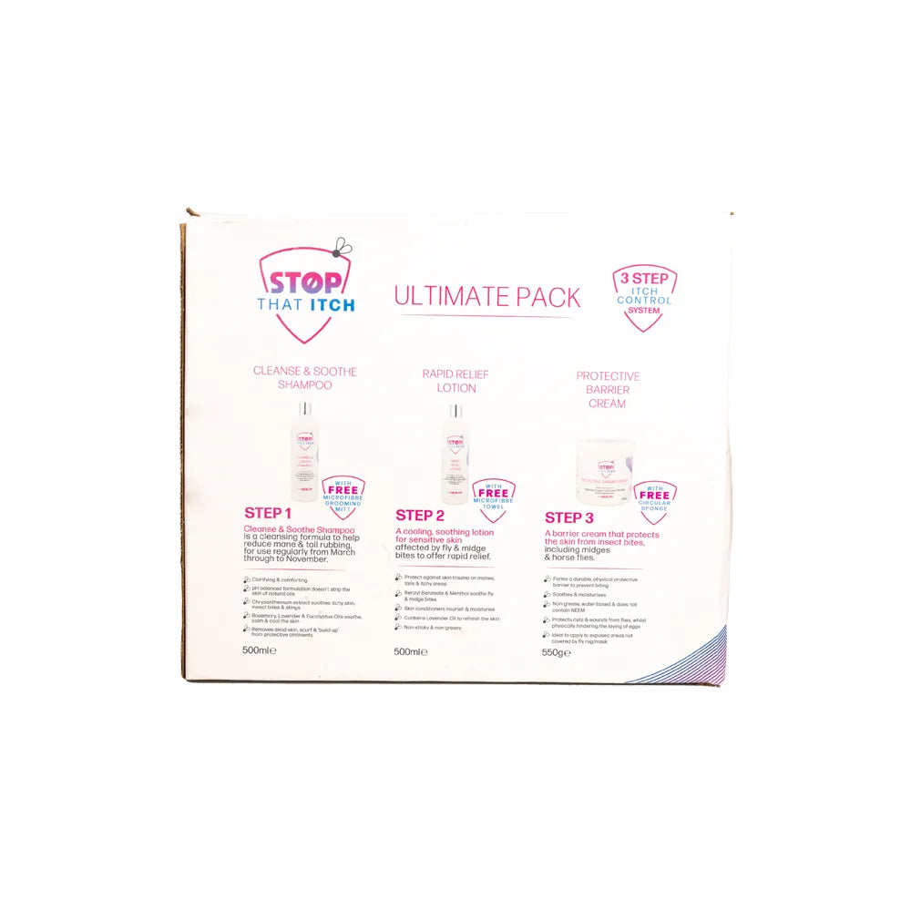 The ultimate pack to STOP THAT ITCH! Contains full sized STOP THAT ITCH products to help manage the seasonal stages of itching, caring for your horse’s skin when annoying flies and midges are irritating your horse and causing discomfort. The 3-step itch management system includes:Cleanse & Soothe Shampoo - 500ml: A cleansing shampoo to help to reduce mane and tail rubbing, for use regularly from March through to November. This clarifying and comforting formulation is pH balanced so it doesn't strip the skin of natural oils. Chrysanthemum extract soothes itchy skin, insect bites and stings whilst the rosemary, lavender and eucalyptus oils soothe, calm and cool. Removes dead skin, scurf and ‘build-up’ from protective ointments. Rapid Relief Lotion - 500ml: A cooling, soothing lotion for sensitive skin affected by fly and midge bites to offer rapid relief. Protect against skin trauma on manes, tails and itchy areas. The Benzyl Benzoate and Menthol soothe fly and midge bites and additional skin conditioners nourish and moisturise. Contains lavender oil to refresh the skin. Non-sticky and non-greasy.Protective Barrier Cream - 550g: A barrier cream which protects the skin from insect bites, including midges and horse flies. Forms a durable, physical protective barrier to prevent biting whilst soothing and moisturising. This non-greasy, water-based and does not contain NEEM and protects cuts and wounds from flies, whilst physically hindering the laying of eggs. Ideal to apply to exposed areas not covered by fly rug/mask.Along with Circular Sponge, Microfibre Grooming Mitt with Microfibre Towel to apply each product.