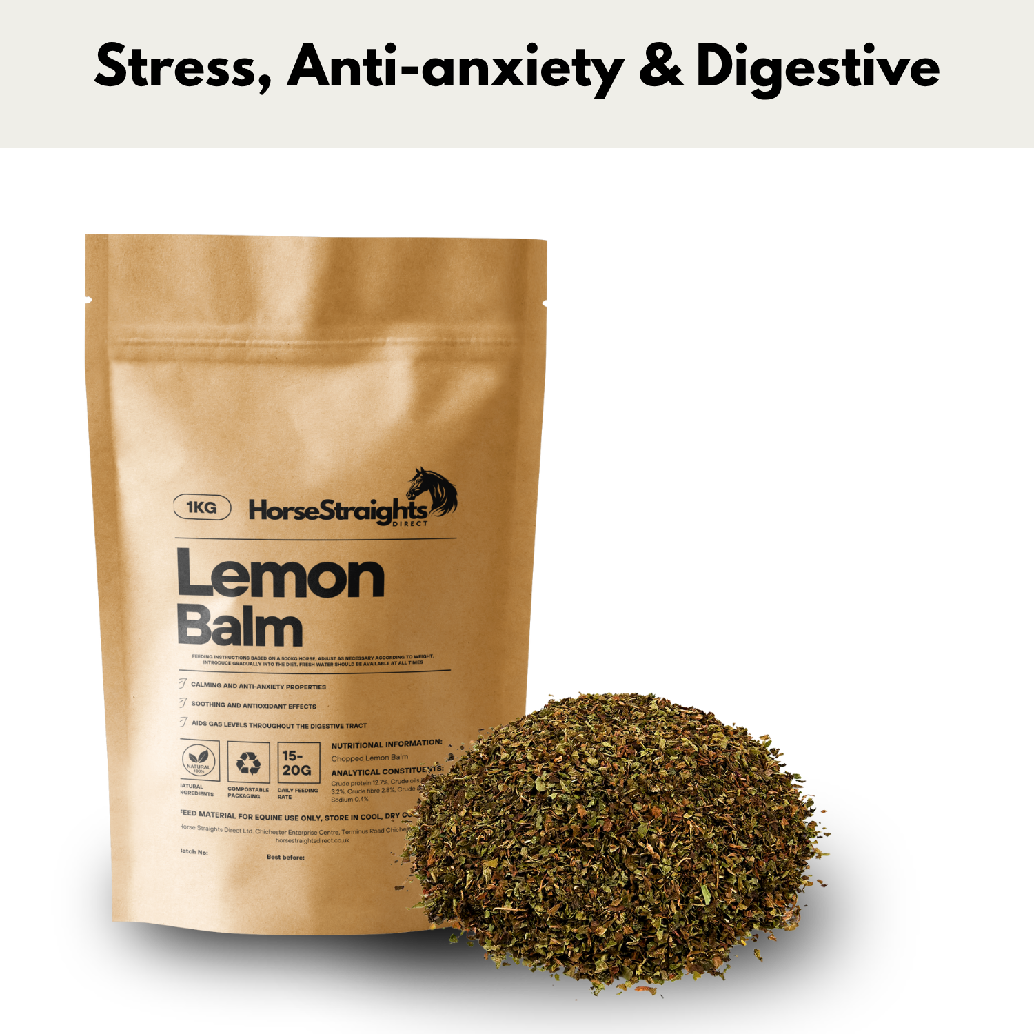 Lemon Balm Chopped For Horses 100% Natural Horse Supplement. Premium Quality Horse Herbs Equine Supplements in 100% Compostable Packaging Horse Straights Direct Lemon Balm Chopped - Tested for Equine Use Only