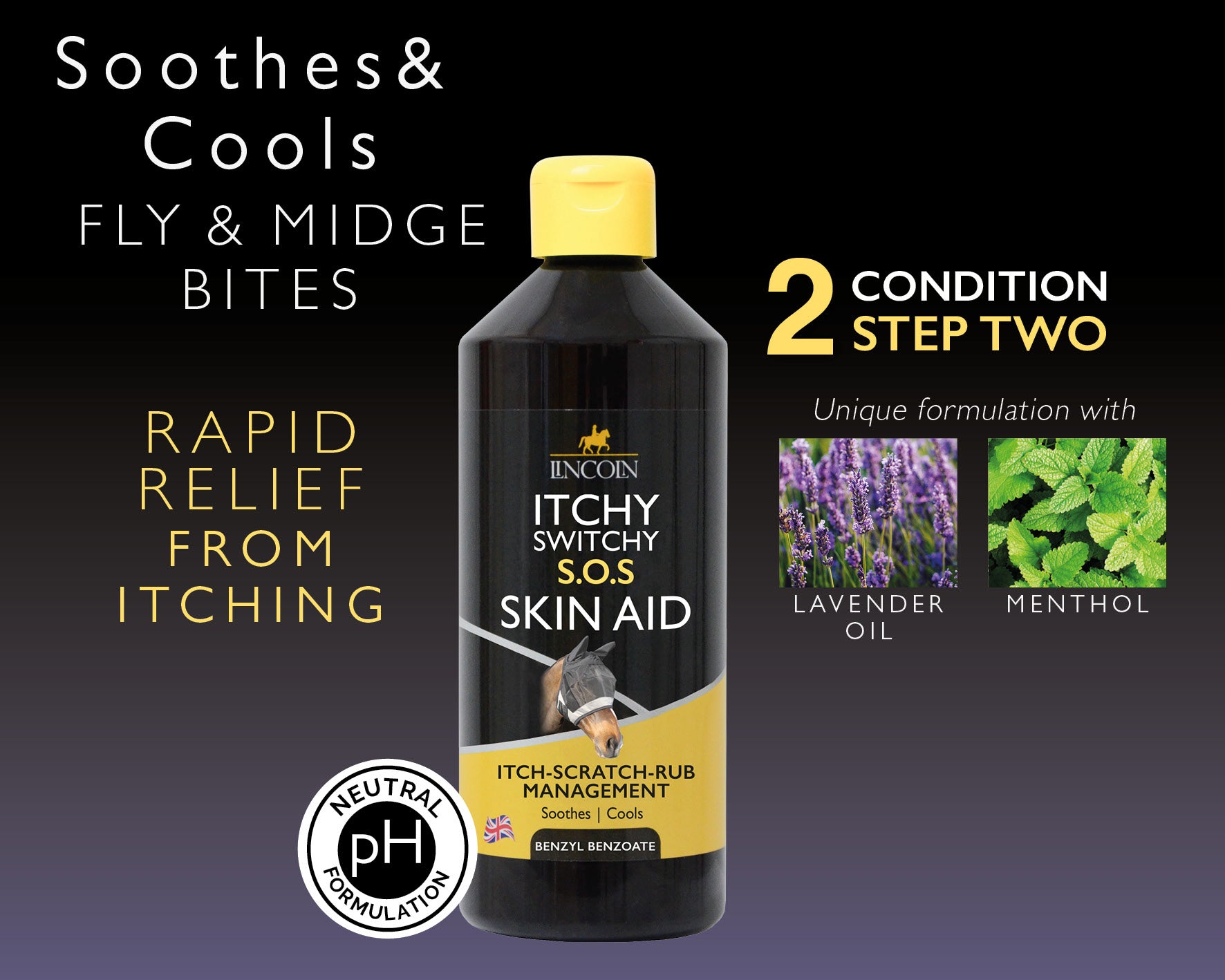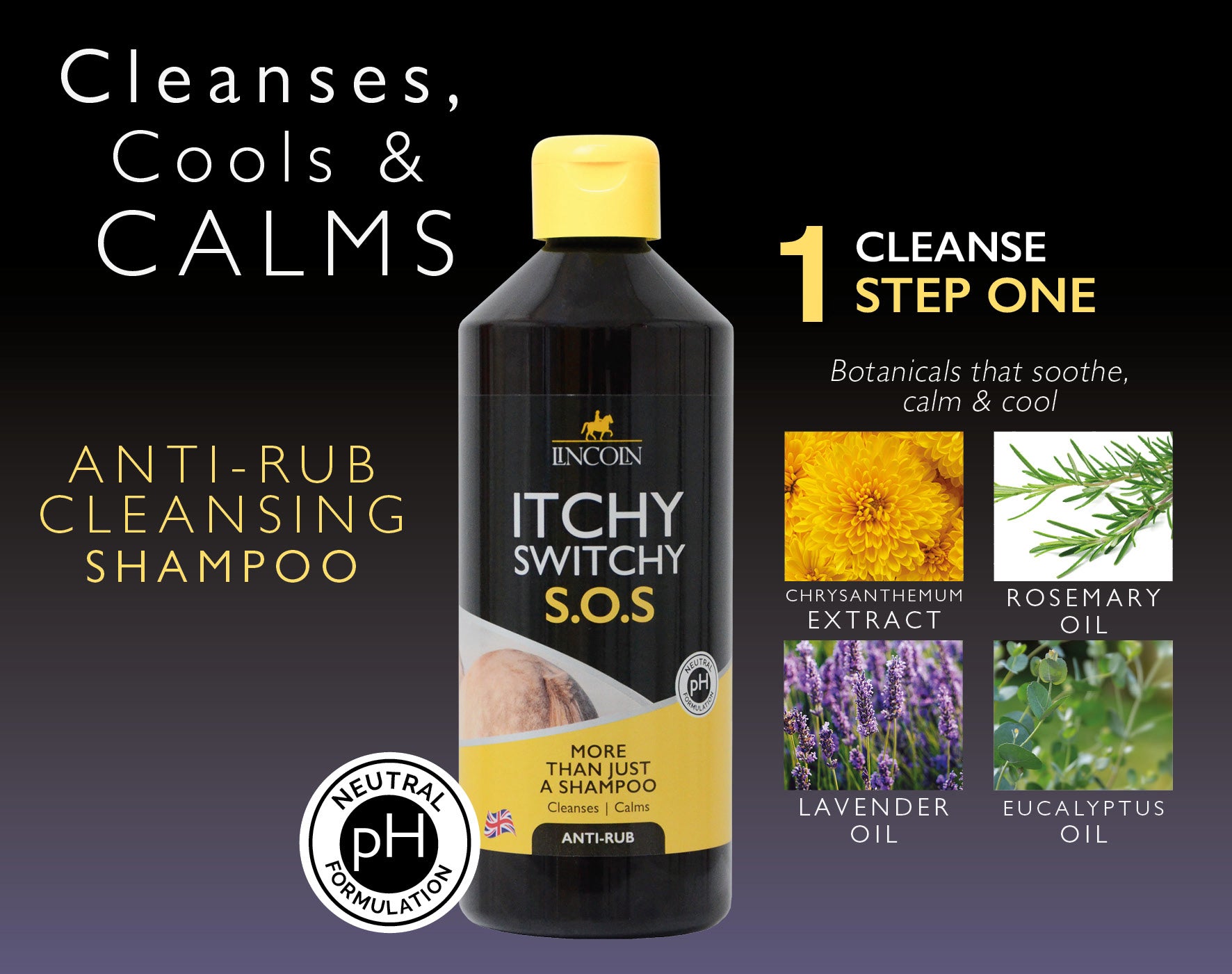 More than just a shampoo! An ‘anti-rub’ cleanser formulated for use regularly from March through to November, or whenever Midges first appear. The pH balanced formulation of Chrysanthemum extract, Rosemary Oil, Lavender Oil & Eucalyptus Oil can be used frequently without drying the skin. Regular use clarifies, removing dead skin & scurf, thoroughly removing ‘build-up’ from protective fly ointments to help to reduce mane & tail rubbing and the associated skin trauma. Silicone free. No added fragrances. For prolonged results, use in conjunction with Itchy Switchy S.O.S Skin Aid.