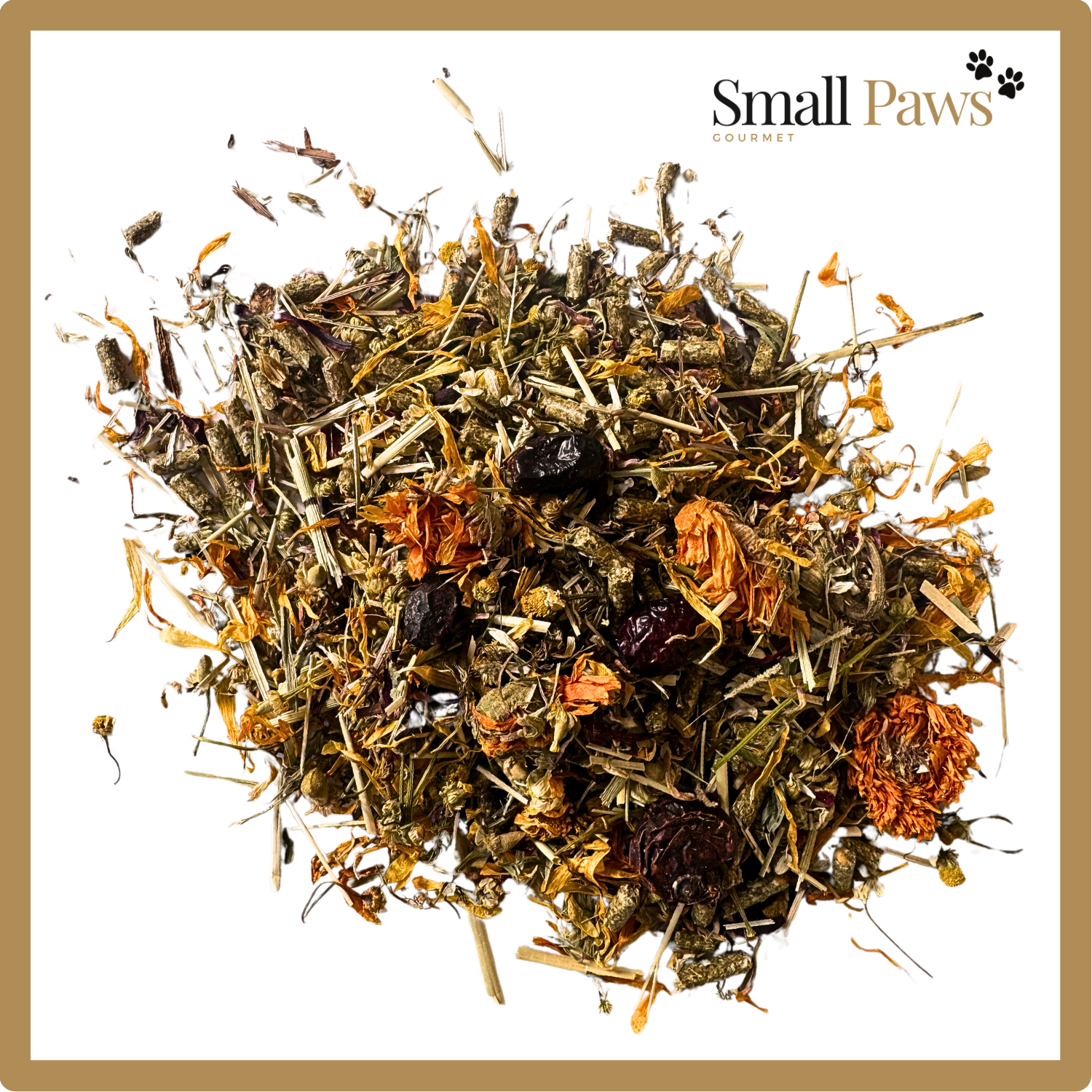 Guinea pig pellets, timothy hay, marigold flowers, hibiscus, rosehips, dandelion leaf and red clover.