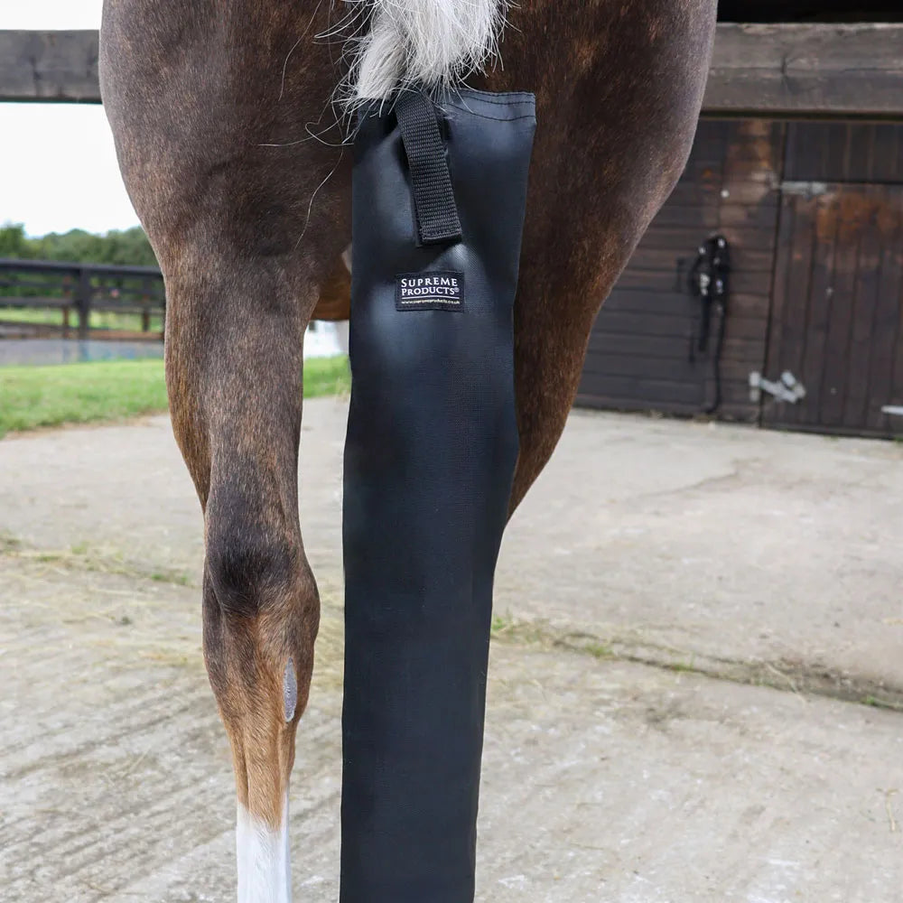 The Supreme Products Waterproof Tail Bag is an equine wardrobe essential, helping keep your horse’s tail clean and pristine. A show day and travel must have, the waterproof tail bag is also great to use in the stable and field all year round to maintain the condition of the hair and help prevent discolouring of white tails. Designed with practicality in mind, the waterproof tail bag allows the addition of a bandage/tail guard if required, has an elasticated pull top to keep the bag securely in place while also acting as a barrier, preventing mud, bedding and anything else that can dirty the tail out! The bag features a loop for threading a plaited tail through for those looking for extra security, full length opening for ease of applying to a thick tail, and a touch tape fastening option on the bottom of the bag allowing you to fold the tail bag in half.