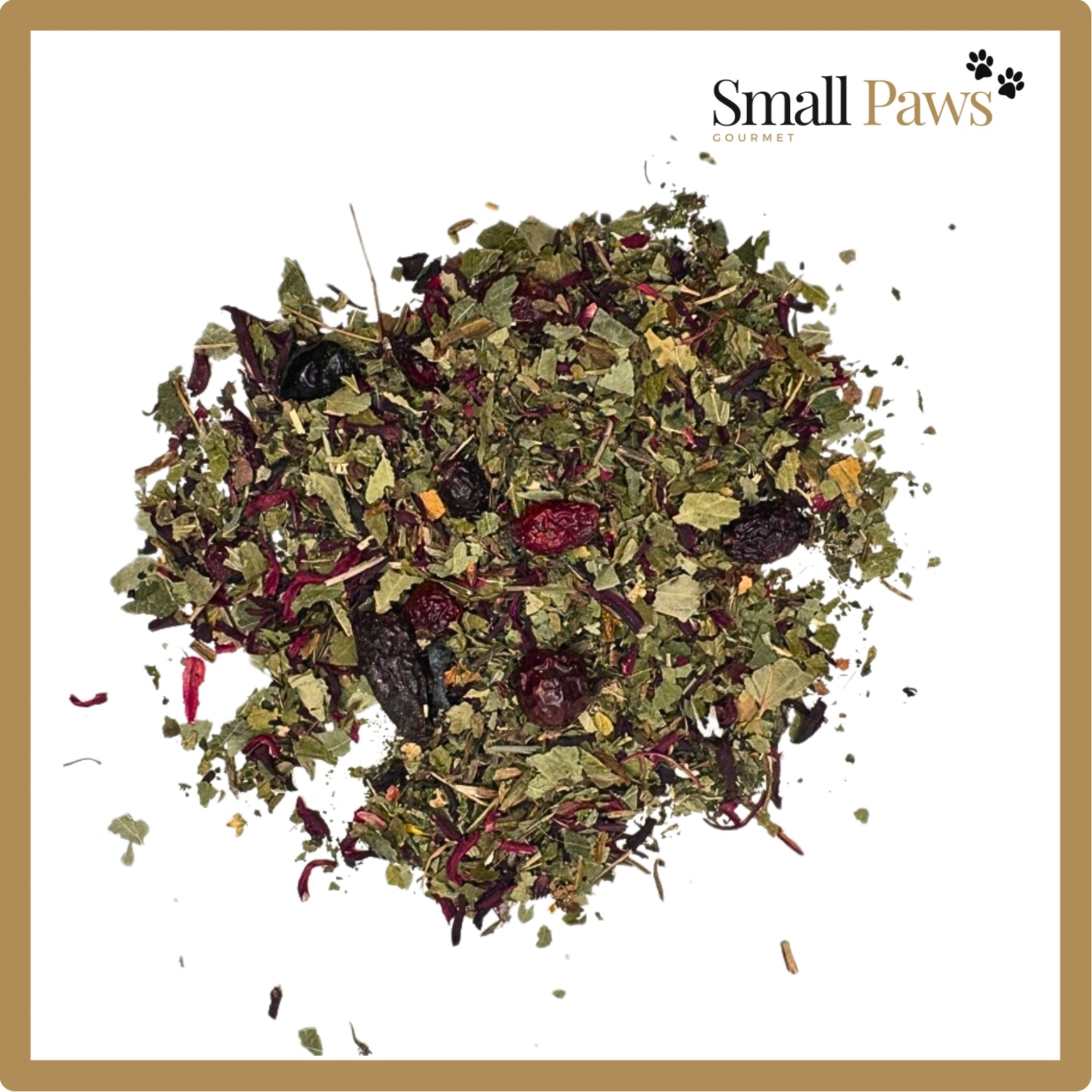 Includes Nettle leaf, dandelion leaf, blackcurrant leaf, birch leaf, hibiscus and rosehips.